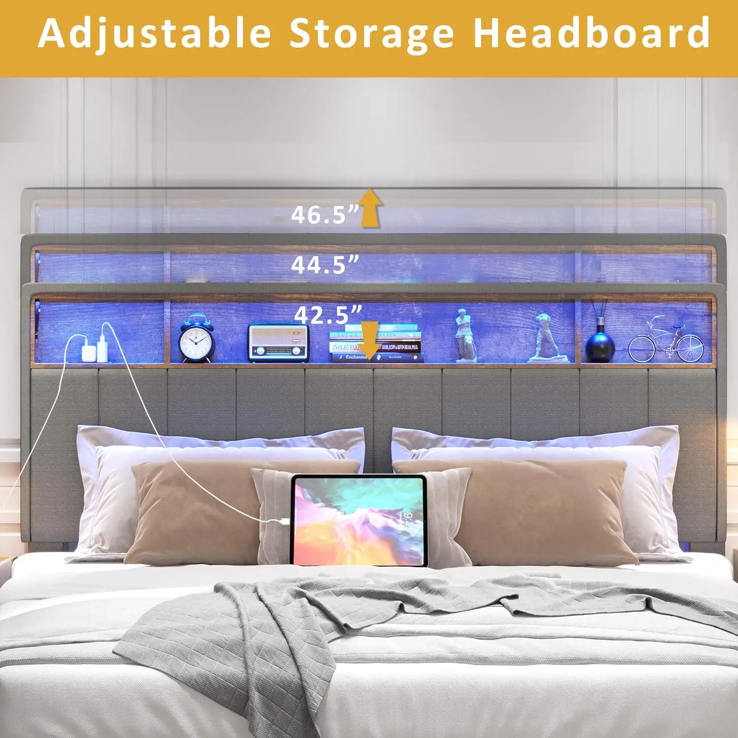 Queen Bed Frame with Built in Charging Station & LED, Noise-Free/Wood Support/No Box Spring Needed